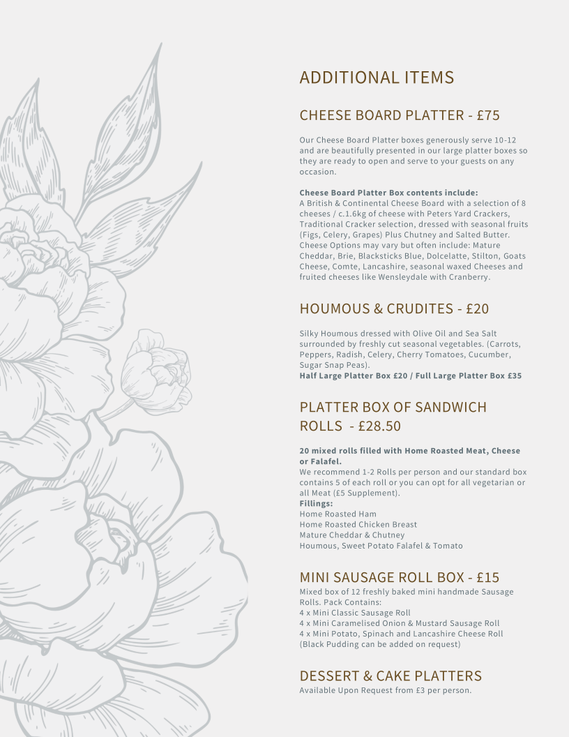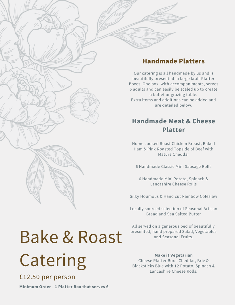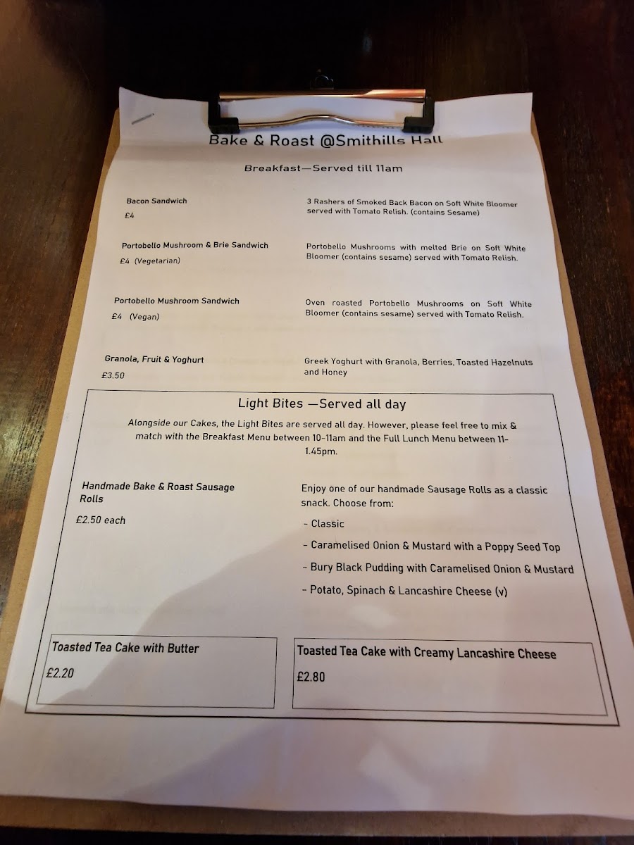 Bake & Roast at Smithills Hall offers a delightful menu that caters to a variety of tastes, with options for breakfast, light bites, and other treats. For breakfast, you can enjoy a hearty Bacon Sandwich, a delicious Portobello Mushroom & Brie Sandwich, or a lighter Portobello Mushroom Sandwich. If you're in the mood for something refreshing, their Granola, Fruit & Yoghurt provides a wholesome start to the day. For those seeking something quick and satisfying, the light bites section features a Toasted Tea Cake With Butter or a more indulgent Toasted Tea Cake With Creamy Lancashire Cheese. The "Others" section of the menu offers a selection of sharing plates, including a Cheese Board Platter and a healthy Houmous & Crudites. If you're looking for a more substantial snack, the Platter Box Of Sandwich Rolls or a Mini Sausage Roll Box would be great choices. To complement your meal, you can sip on a comforting Flat White. With a variety of flavors and options, Bake & Roast provides a cozy and inviting menu for every occasion.